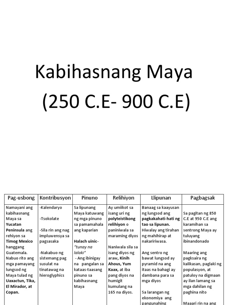 Kabihasnang Maya / Sinaunang gresya kabihasnang minoan at mycenaean. Kabihasnang Maya - Ang kabihasnang maya ay namuhay noong 2000 bce.